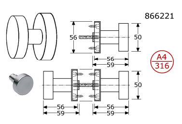 deurtrekknoppen, cilindervorm Ø50mm roestvrijstaal 316/1.4401 mat gepolijst met vaste rozet ø56x8mm, niet-draaibaar montage via achterzijde als ENKELE knop zwaar model, onzichtbare bevestiging vanaf buiten niet te demonteren met nokken tegen verdraaien verpakt per 6 stuks