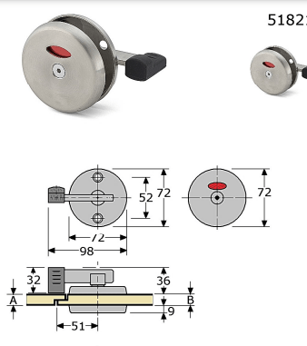 * aan voorzijde roestvrijstalen rozet 072x9mm met rood/blauw bezet-aanduiding + noodbediening voorzien van korte vaste RVS stift #6x6x25mm onzichtbare bevestiging, boorgat minimaal ø17mm * aan achterzijde roestvrijstalen rozet ø72x9mm met roestvrijstalen overslag met zwart rubber dop met 2 verzonken schroefgaten h.o.h. 52mm (M5) voor 12-20mm deurdikte bij een gelijkliggende deur (of half-voorliggend, zie ook schema beneden) (zwarte onderrozet 518227 h=7mm apart opgeven) draaibeweging 100°/180°, geen sluitplaat