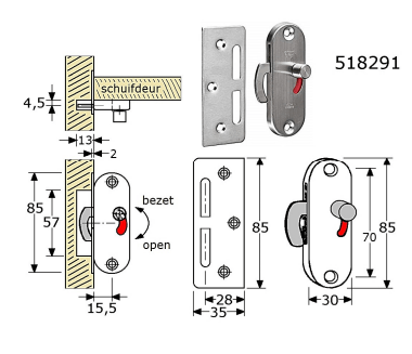 met rood/blauw bezet-aanduiding aan voorkant direkt onder de roestvrijstalen knop ø11mm (bediening en “bezet” zitten aan zelfde kant) met handige roestvrijstalen haakschoot 2mm uitslag 13mm, vergrendeld achter speciale sluitplaat zeer geschikt voor kleine schuifdeuren,